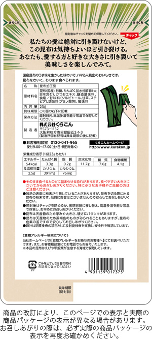 | 原材料名 | 昆布(国産)、砂糖、たんぱく加水分解物(大豆を含む)、かつおエキス、醸造調味料、食塩/甘味料(ソルビトール、甘草、ステビア)、調味料(アミノ酸等)、酸味料 | ||||||||||||||||||